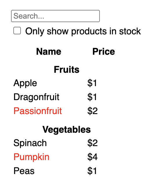 If you look at ProductTable (lavender), you’ll see that the table header (containing the “Name” and “Price” labels) isn’t its own component. This is a matter of preference, and you could go either way. For this example, it is a part of ProductTable because it appears inside the ProductTable’s list. However, if this header grows to be complex (e.g., if you add sorting), you can move it into its own ProductTableHeader component.
